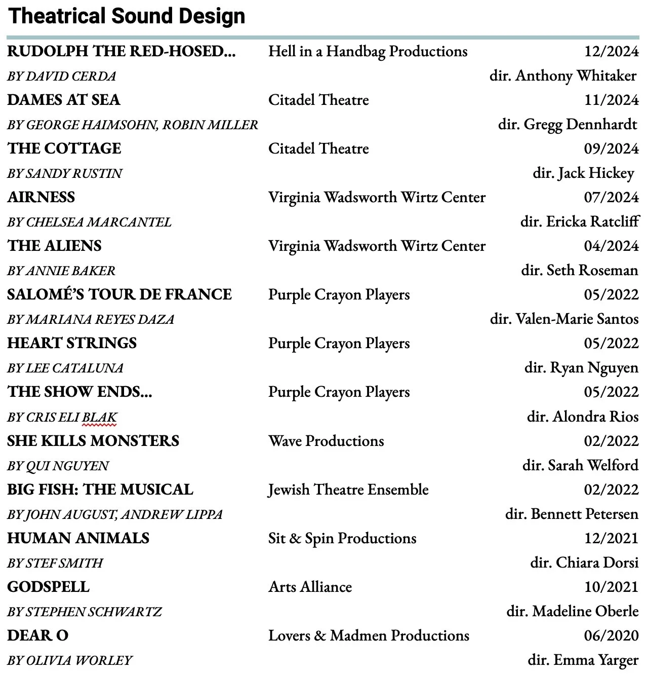 Day two of tech for The Aliens at the Virginia Wadsworth Wirtz Center. Annie Baker puts a lot of emphasis on naturalistic dialogue in this play, so that fed into the soundscaping. I did a lot of field recording and mixed that with some specific library sounds to make a realistic depiction of Vermont that could subtlety evolve with the tone of the scene. This was juxtaposed with loud and brash songs between scenes giving us a glimpse into the feelings of the character KJ.